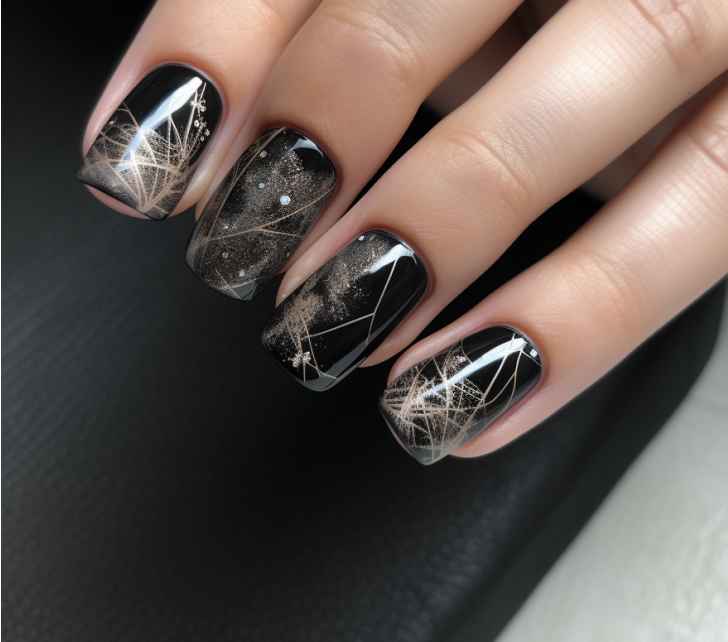 - Короткие ногти приобретут гармоничный вид, если прибегнуть к созданию на них негативного пространства. Ногти покрывают прозрачным лаком, на который наносят блестящие разводы фольгированной потали, рисунки, выполненные контурным черным цветом.