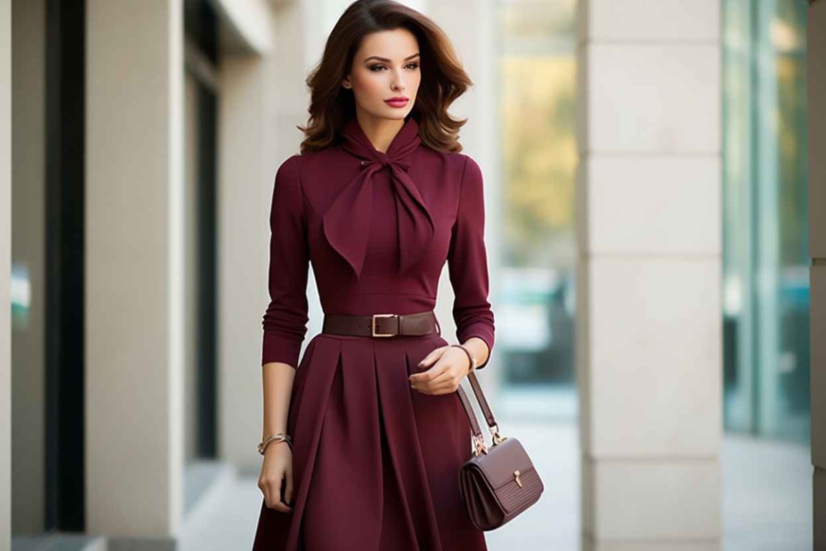 - Профессиональный шик. Оденьтесь в темно-синее или бордовое платье и сочетайте его с черными лодочками и сумкой в идентичной тональности. Добавьте акцент с помощью золотых украшений.