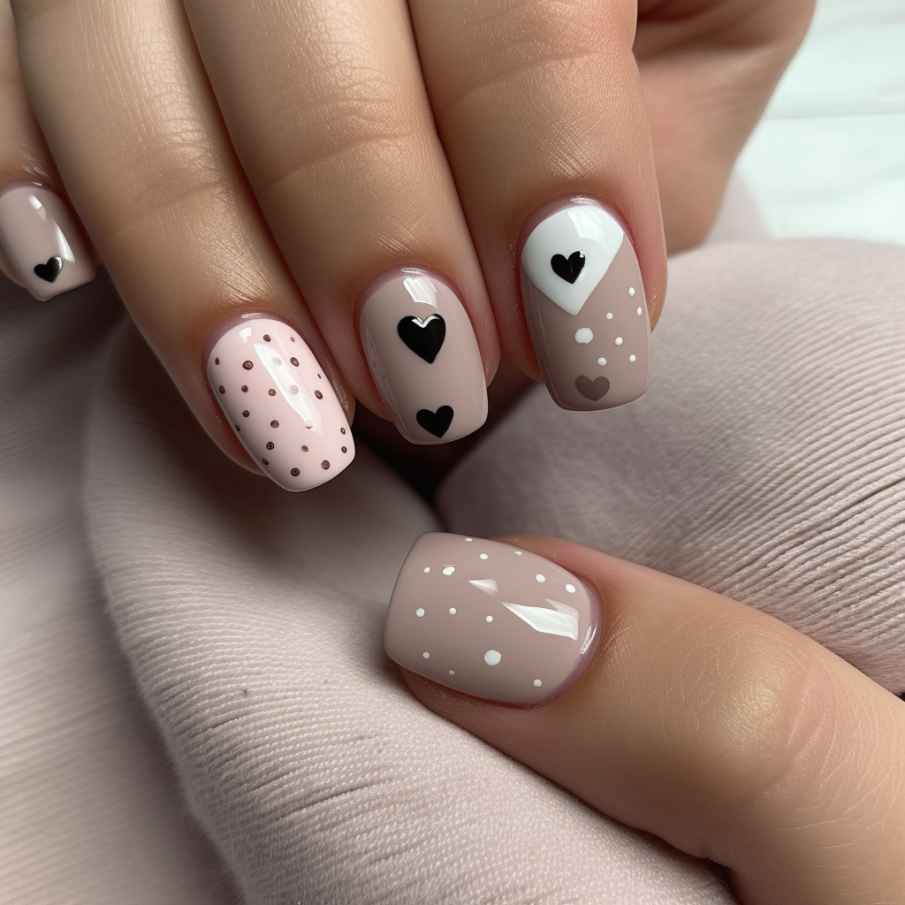 - Любительницы романтичности оценят дизайн, украшенный сердечками. Рисунки наносятся на светлый фон, выполненный в нежных пастельных или кофейных оттенках. Поверх изображаются сердечки, которые прорисовываются лаком, выкладываются блёстками либо стразами, выполняются в объёмном виде с помощью техники лепки.