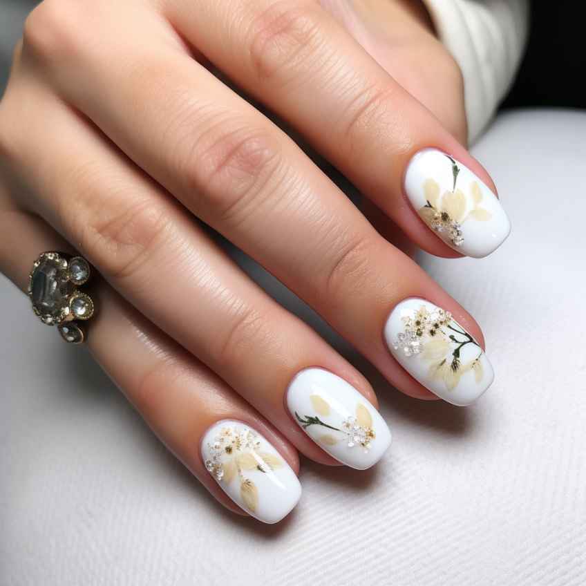 - Белый цвет неизменно ассоциируется со свадьбой. Вы можете выбрать белый лак для ногтей с мелким шиммером, чтобы добавить немного блеска и сияния свадебному маникюру.