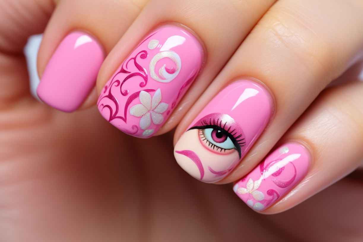 - Любительницы романтичных луков оценят дизайн в стиле «Барби», выполненный в ярком розовом оттенке. Усилить впечатление поможет финишное покрытие пластин блестящей втиркой. При желании на яркий малиновый фон наносят белые точки в виде горошка, придавая нейл-арту сходство со стилем ретро.