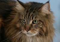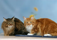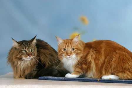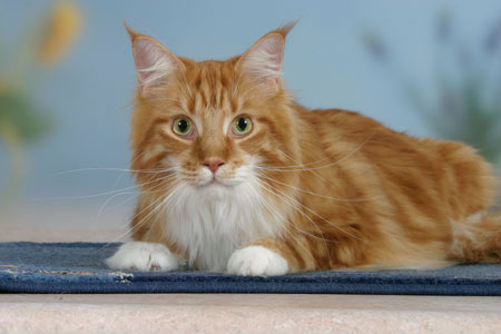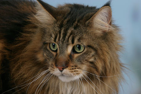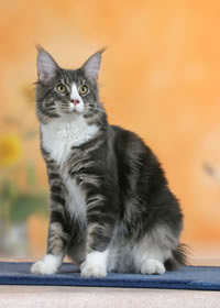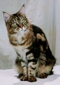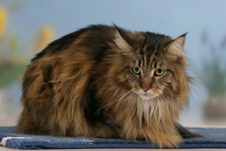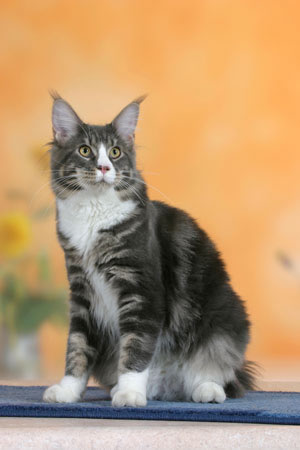 Мэйн-Куны развиваются сравнительно медленно. Своего нормального размера они достигают к 3-5 годам. И что самое удивительное - на протяжении всей своей жизни они сохраняют мягкий, добродушный нрав котенка. Даже их голос - нежная трель, или раскатистое мурлыканье, которое они используют для лести людям и выражения своих эмоций. Очень редко можно услышать громкий вой или призывное мяуканье.
