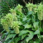 Эвкомис двуцветный прекрасно подходит к условиям выращивания в оранжереях. Ароматные цветки собраны в густые цилиндрические соцветия длиной до 30 см бронзового цвета с коричневой верхушкой. Образуются поздним летом.