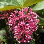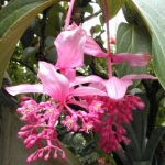 Мединилла величественная - вечнозеленый кустарник, в комнатных условиях достигает 1 м, полуэпифит. Побеги четырехгранные, покрытые трещиноватой корой, напоминающие пробку. Особую декоративность придают крупные, розоватые с параллельными ярко-розовыми жилками прицветники. Это редко встречающееся в комнатной культуре растение требует тщательного ухаживания: влажных тропических условий содержания, не переносит резких перепадов температур и сквозняков. Для придания декоративной формы проводят весеннюю обрезку, обрезанные побеги можно использовать на черенки.