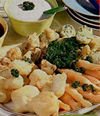 На 4 порции: 1 зубчик чеснока, 150 г сметаны, 50 мл майонеза, 1 ст. ложка уксуса на травах, соль, перец, 750 г овощей (морковь, цветная капуста, брокколи), 250 г шампиньонов, 1 пучок петрушки, 2 желтка, 125 г муки, 2 ст. ложки растительного масла, 150 мл белого вина, сахар, 500 мл рапсового масла для фритюра.