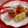 4. Потушенную соевую стружку и мякоть помидоров перемешать, поперчить, посолить и наполнить этим помидоры.