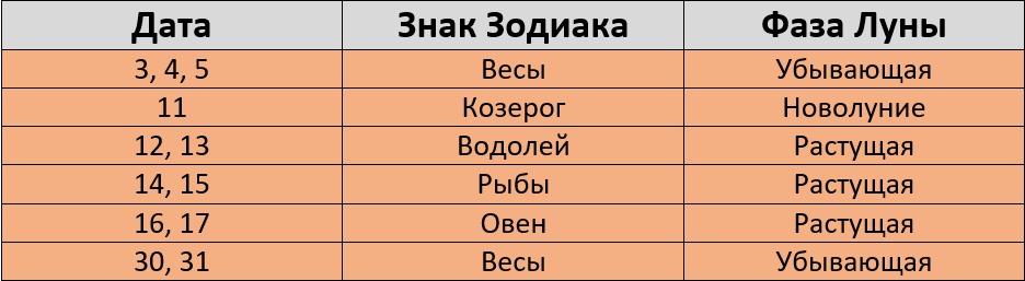 Собираясь к парикмахеру, стоит учитывать как фазы Луны, так и другие важные астрологические факторы. Например, транзит ночного светила через зодиакальные созвездия. Лунный календарь позволяет выделить несколько благоприятных дней для стрижки в январе 2024 года. Они перечислены в таблице ниже.