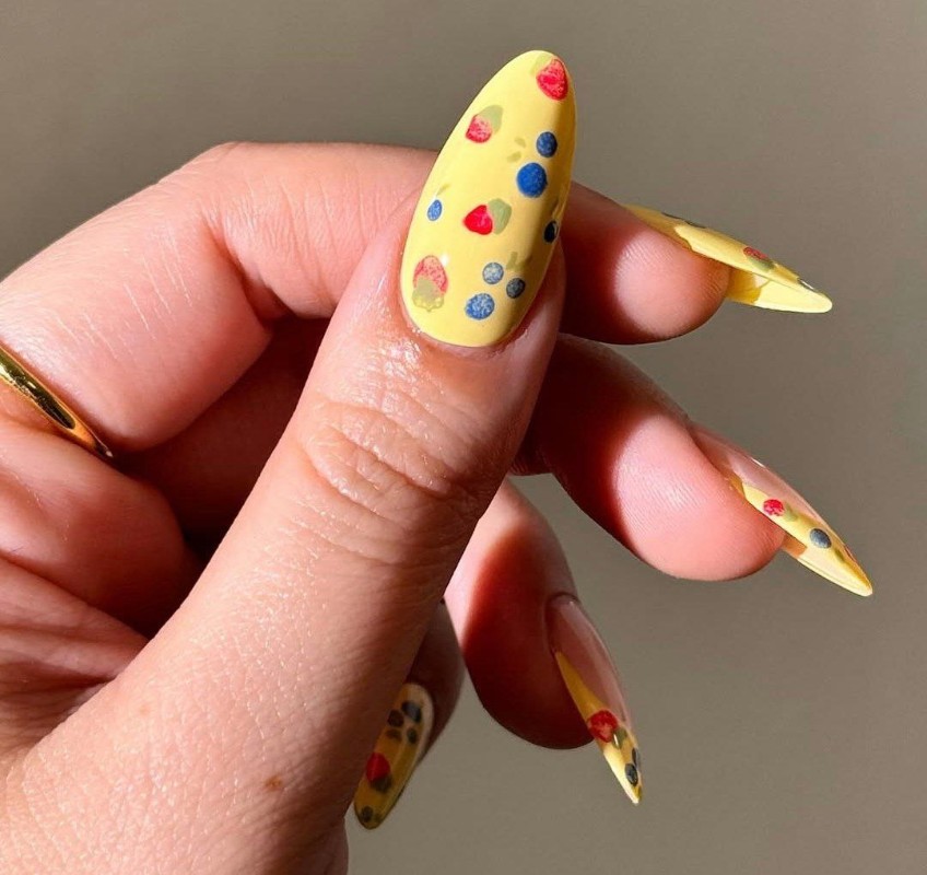 Не знаете, какие ягоды и фрукты выбрать для дизайна маникюра? Можно замиксовать их вместе! Например, сделав угловые рисунки на каждом ногте.