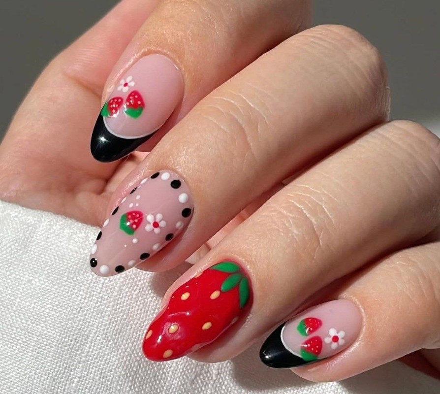 Добавление черного лака в клубничную красно-бело-зеленую палитру – нестандартное решение. Выглядит контрастно, подходит для тех, кто любит привлекать внимание.