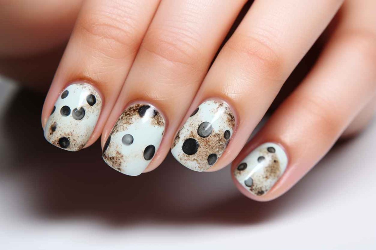 - Маникюр с эффектом перепелиного яйца – это довольно интересный и необычный дизайн. Выберите светлый и нейтральный цвет, который будет служить основным фоном. Обычно используют нежные бежевые, светло-серые, пастельные матовые или перламутровые оттенки. Узор выглядит, как мелкие точки, выполненные темным цветом. Для создания текстуры, характерной для перепелиных яиц, вы можете воспользоваться определенным методом. Таким вариантом является спонж-техника. Для ее воплощения заготовьте маленькую губку или салфетку. Нанесите на нее несколько капель лака в темных оттенках и аккуратно постукивайте этой губкой по ногтям. Это создаст неровную текстуру, похожую на пятна на яйцах.