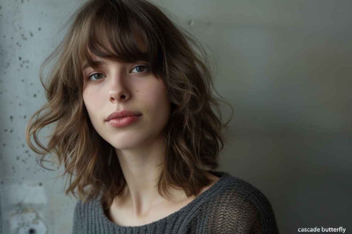 - Воплотить женственный образ поможет прическа «каскад» или «бабочка». Ее особенность заключается в многоуровневом выстригании прядей. Верхний слой может начинаться в области челки. Ее делают удлиненной, доходящей до уровня скул.
