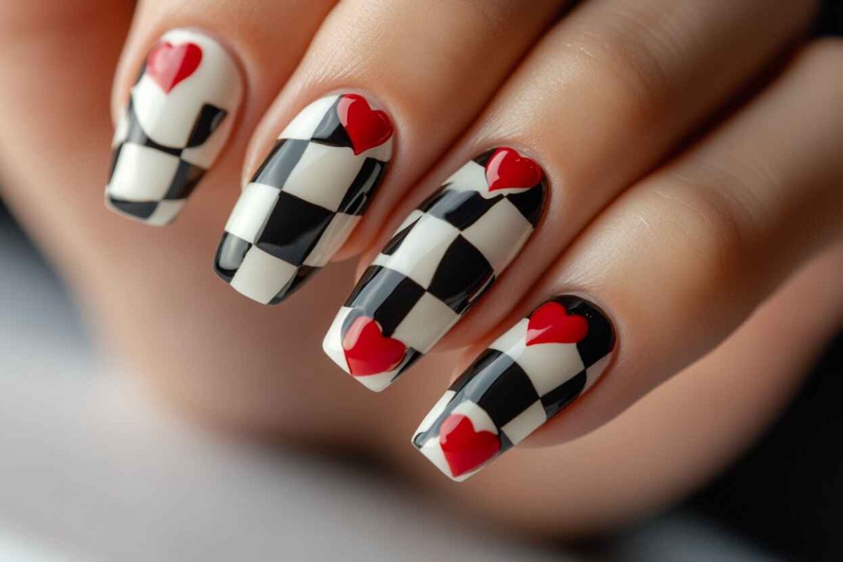 - Молодежный маникюр будет выглядеть стильно и креативно, если дополнить его яркими оригинальными рисунками. В качестве последних может выступать клетчатый орнамент, многократно повторяющиеся изображения сердечек.