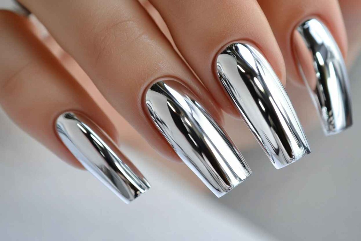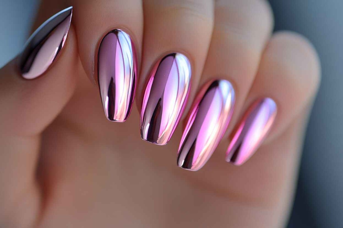 - Неординарно и креативно будет смотреться дизайн ногтей, создающийся с помощью хромированных блестящих покрытий, нанесенных в разных оттенках на соседние пальцы.