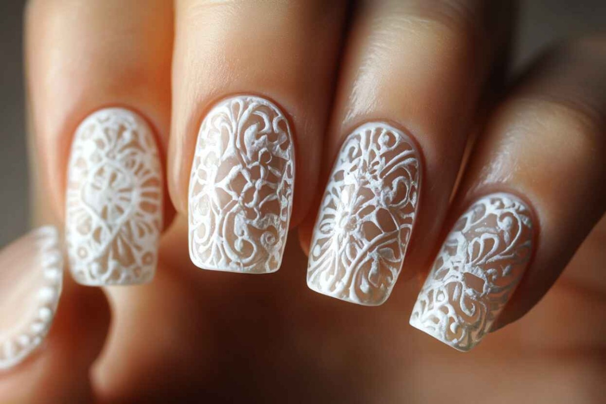 - Романтичный образ поможет воплотить нежный кружевной орнамент, выполненный в традиционном белом цвете. Дизайн будет выглядеть более интересно, если украсить его объемными белоснежными бантами, выполненными в технике лепки.