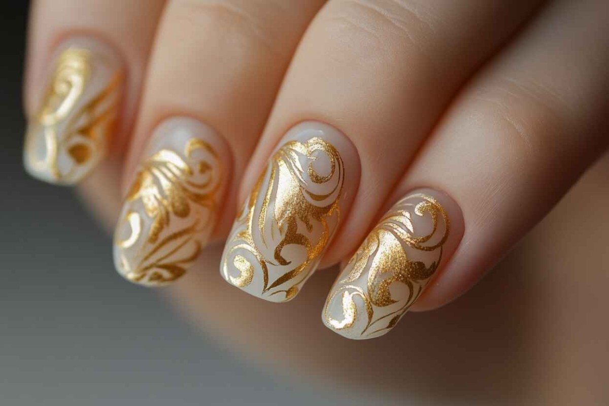 - Сочетание блестящего декора и негативного пространства. Примером выступает нейл-арт, в котором совмещен объемный орнамент золотистого цвета, создающий узоры в технике лепки, плавно переходящий в прозрачное покрытие.