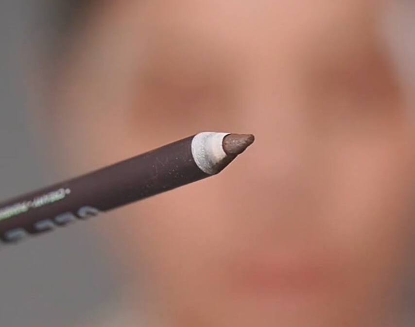 Вам нужен хороший карандаш-кайал. И кисть со скошенным срезом. Нужно прокрасить эту кисть карандашом с двух сторон. Проверьте, чтобы кисть была плоская и тонкая, как лезвие. Действовать нужно быстро, потому что карандаш-кайал быстро застывает, и в этом его главный плюс. Прикладываем кисть скошенной частью к внешней линии глаза, к его разрезу, и надавливаем. У нас с вами получается направляющая – хвостик стрелки.