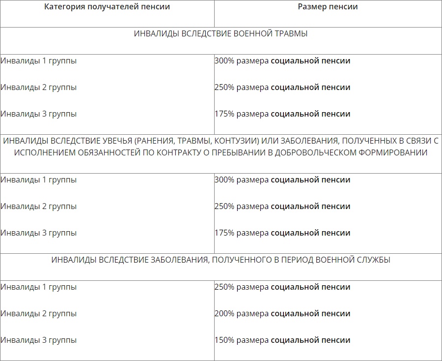 Для расчета Соцфонд использует размер социальной пенсии (7689,82 рубля), умноженный на коэффициент группы. Он считается базовым. Например, пенсия по инвалидности 1-й группы вследствие военной травмы составит 23069,46 рубля (300% от базы).