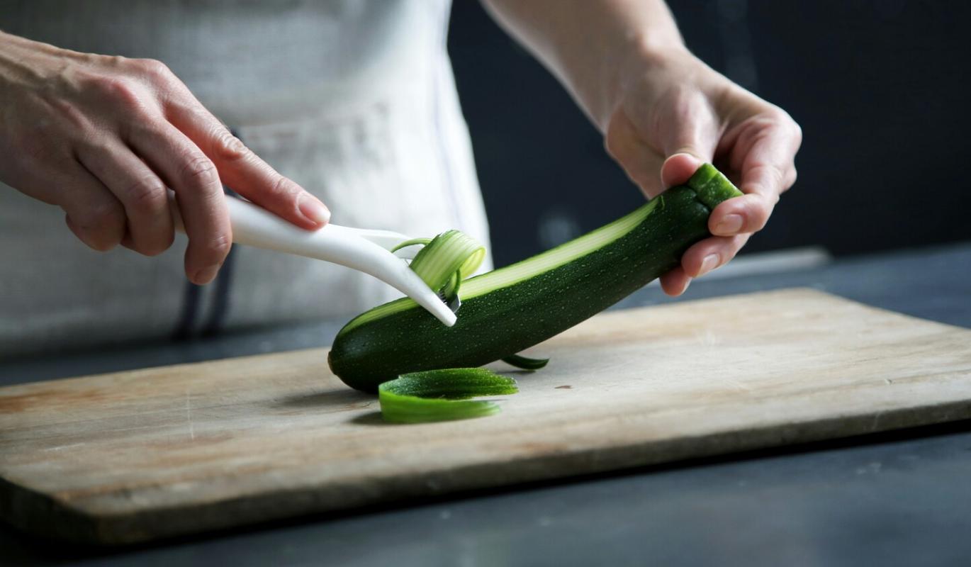 - Нарежьте кабачки длинными тонкими полосками. Это можно сделать с помощью овощечистки или специальной терки для спагетти.