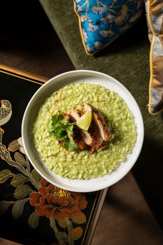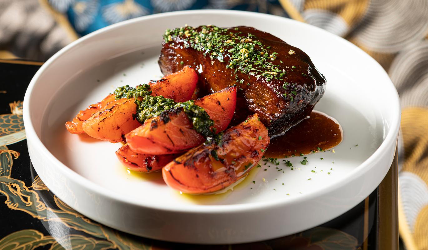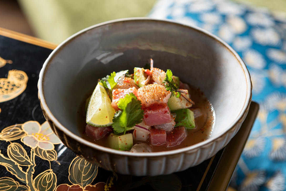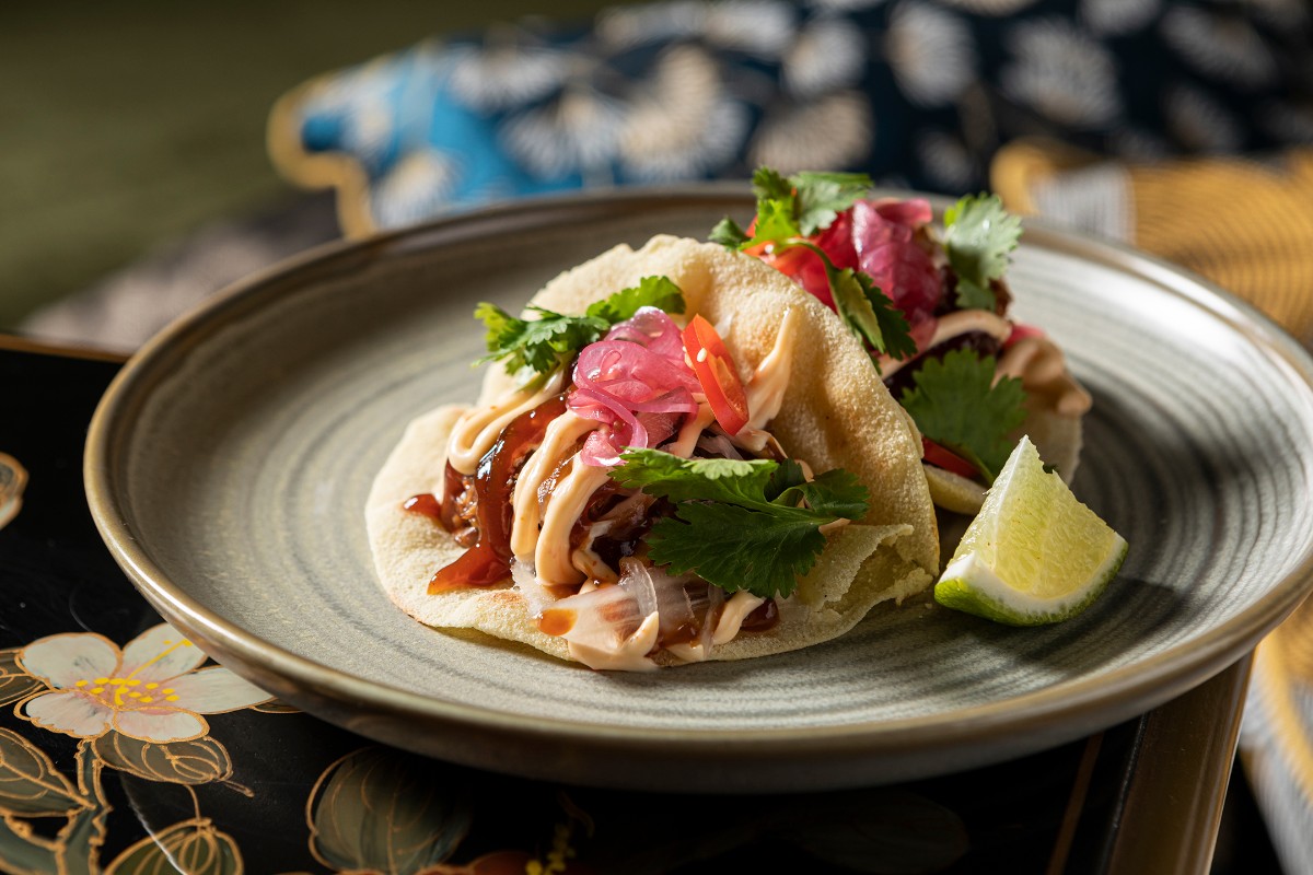 За гастрономическое сопровождение отвечает Александр Ермаков (Бистро De Torino, Fiorentini). Меню получилось относительно компактным, но вместе с тем разноформатным и совсем непростым. На аперитив подают оливки ночелада, вяленые томаты, батат фри с чили-айоли и ананас кимчи с невероятно бодрящим вкусом. На закуску можно отведать довольно плотный тартар из тунца на брусочке жареного риса, яркое и пряное севиче из гребешка, тунца и креветки и два вида тако – с курицей и рваной говядиной.