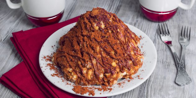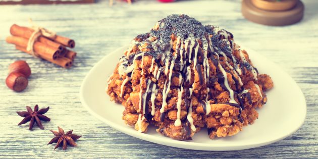 - Посыпьте торт «Муравейник» с вареной сгущенкой шоколадной крошкой и маком.