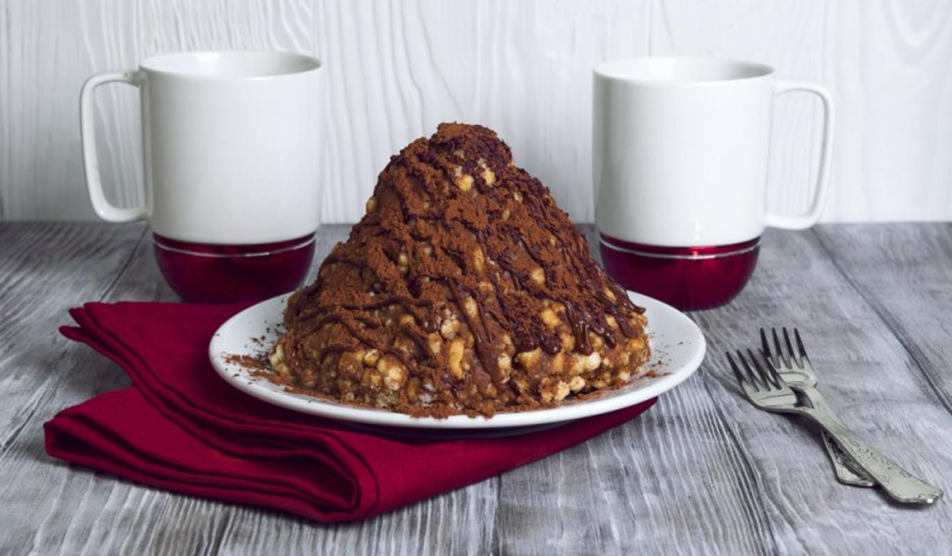 - Перемешайте крем с тестом, выложите массу на блюдо, формируя горку. Уберите заготовку в холодильник на 2 часа или на дольше.
