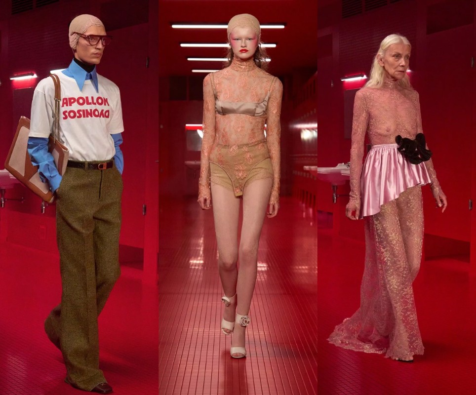 Бывший креативный директор Gucci, Алессандро Микеле, представил свою вторую по счету коллекцию на посту в модном доме Valentino. По словам критиков, от былой эстетики Пьерпаоло Пиччоли, который работал на бренд последние двадцать пять лет, мало что осталось. Прежняя элегантность Valentino трансформировалась в андрогинную причудливость в стиле Алессандро Микеле. Для показа были созданы декорации в виде общественного туалета с красно-неоновой подсветкой – метафора разрушения границы между интимным и общественным.