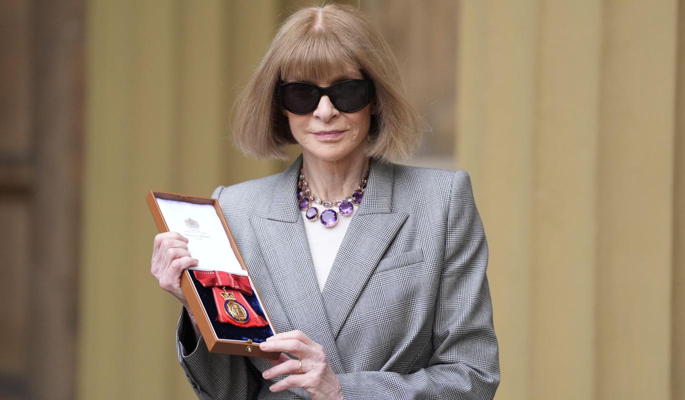 Для торжественного события Винтур выбрала сдержанный наряд: элегантный серый юбочный костюм и коричневые сапоги. Образ знаменитости дополняли фирменные черные солнцезащитные очки. Однако, следуя королевскому протоколу, во время вручения ордена она их сняла. В момент, когда Карл III прикрепил награду к ее пиджаку, журналистка подарила монарху улыбку и пожала ему руку.