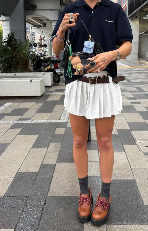 Спортивные элементы одежды важно грамотно балансировать женственным стилем. В топе главных атрибутов женственности и антитезой маскулинности Bloke Core являются юбки. Особой популярностью пользуются мини-юбки плиссе на стыке балетного и теннисного стиля. Юбки миди тоже отлично впишутся в образ в стиле Blokette Core, особенно если они будут выполнены из кружева или денима а-ля винтаж.