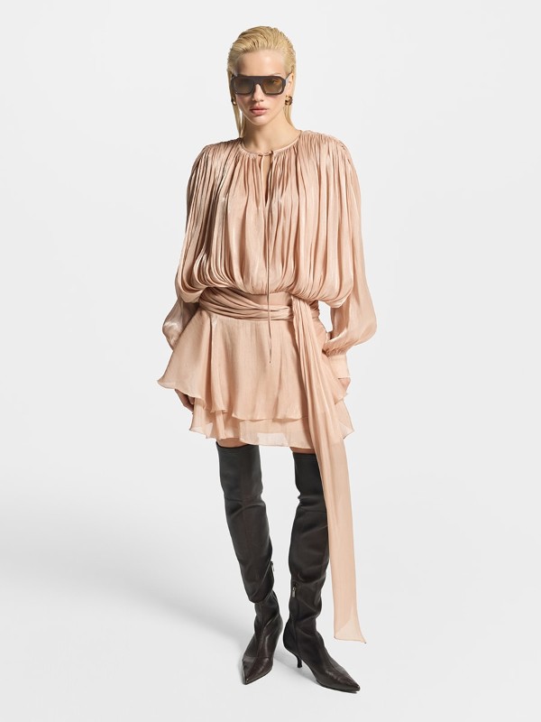 Классика праздника – нарядно, но не вычурно. Носите их навыпуск, чтобы создать эффект летящего наряда. Выбирайте модели из атласа или любой блестящей ткани, чтобы у всего образа появилась динамика (это тоже большой тренд). Если будет холодно, можно накинуть удлиненный oversize жакет немного мужского кроя, который полностью закроет длину платья. Носите с ботинками на тракторной подошве и длинными сапогами-чулками, тогда образ будет сексуальным даже без откровенного выреза и экстремальной длины мини.