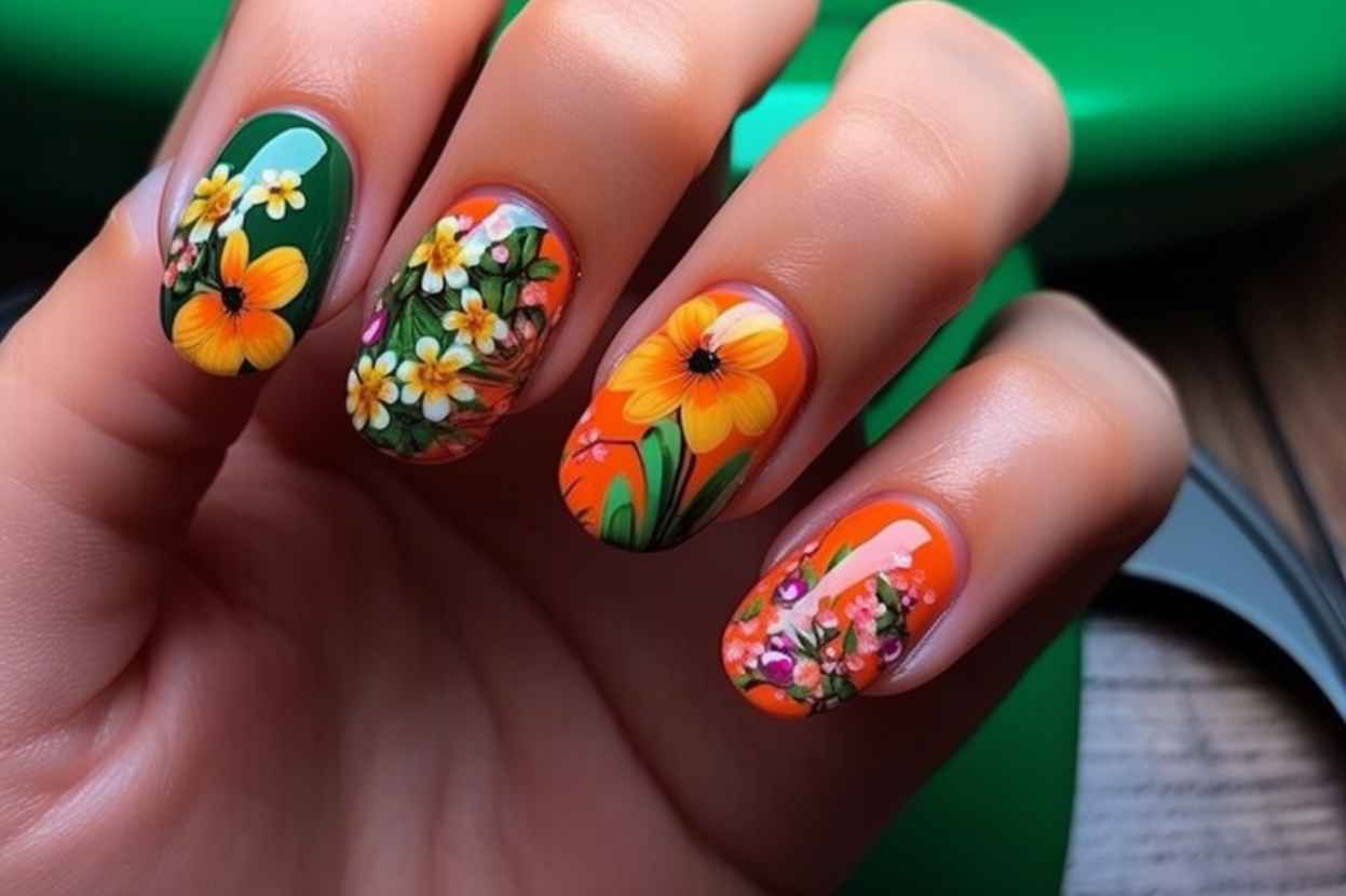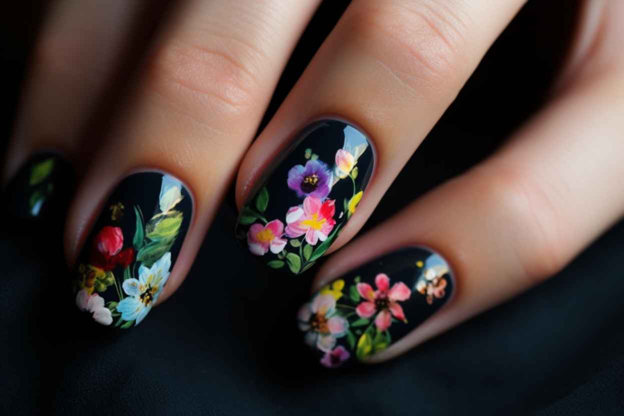 - Цветы неизменно являются популярным выбором для маникюра, привнося в него женственные нотки. Вы можете нарисовать нежные флористические узоры или яркие цветы на каждом ногте. Чтобы лепестки выглядели максимально реалистично, можно прибегнуть к технике акварель.