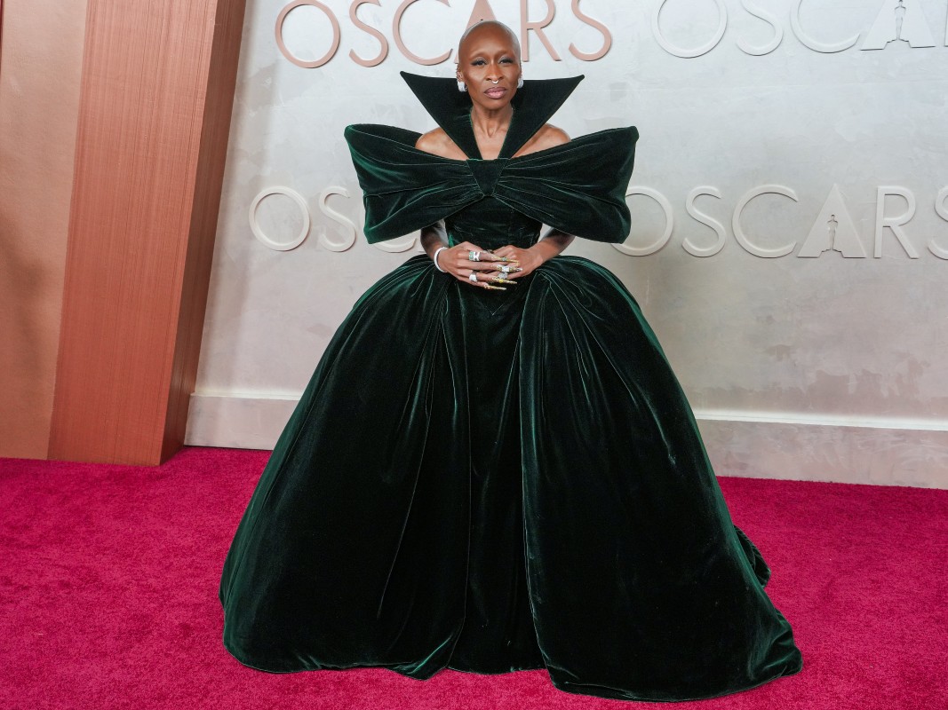 Награда за самый запоминающийся и самый многогабаритный образ на красной дорожке Оскара 2025 однозначно достается актрисе Синтии Эриво. Платье выделяется не только пышной юбкой, занимающей несколько квадратных метров красной дорожки, но и глубоким изумрудным цветом, бархатным материалом и воротником в стиле Дракулы. Весь этот образ – дело рук Louis Vuitton.