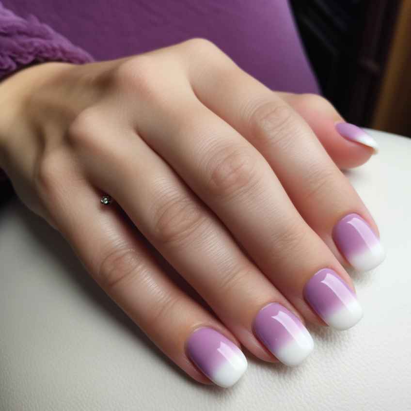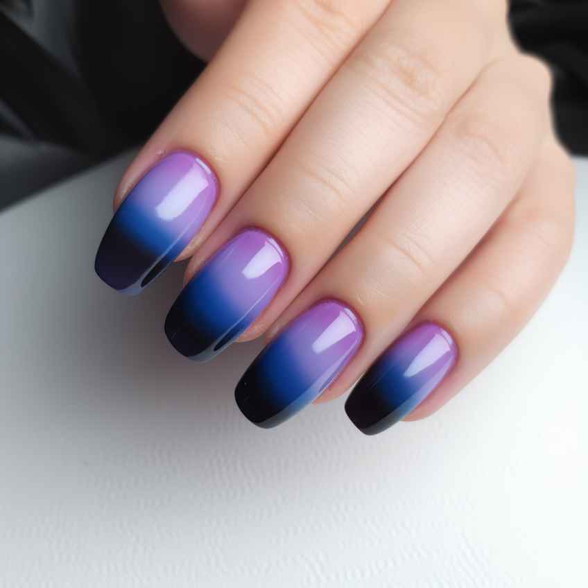 - Создайте эффект плавного градиентного перехода цветов на ногтях. Выберите два или более оттенка лаков, которые хорошо сочетаются между собой. Альтернативное решение – сделать омбре с помощью растяжки блестками.