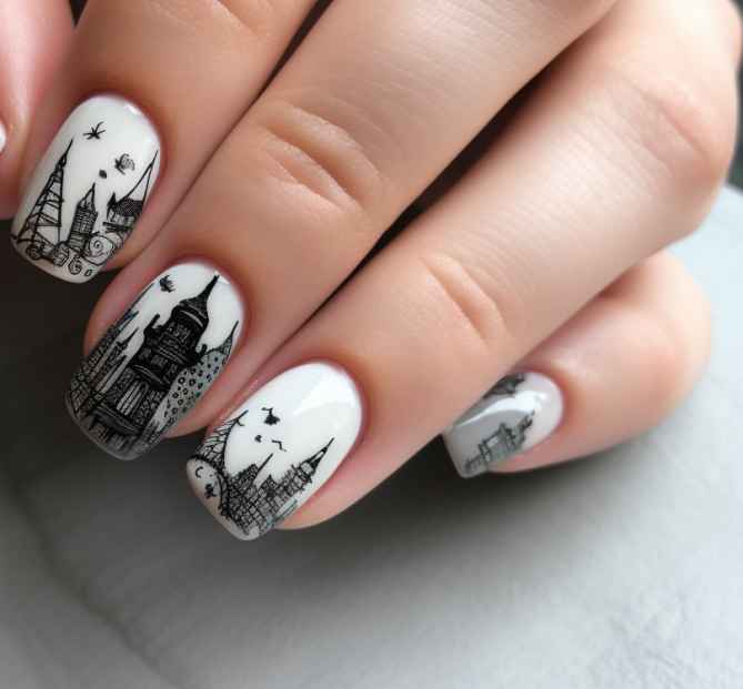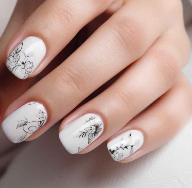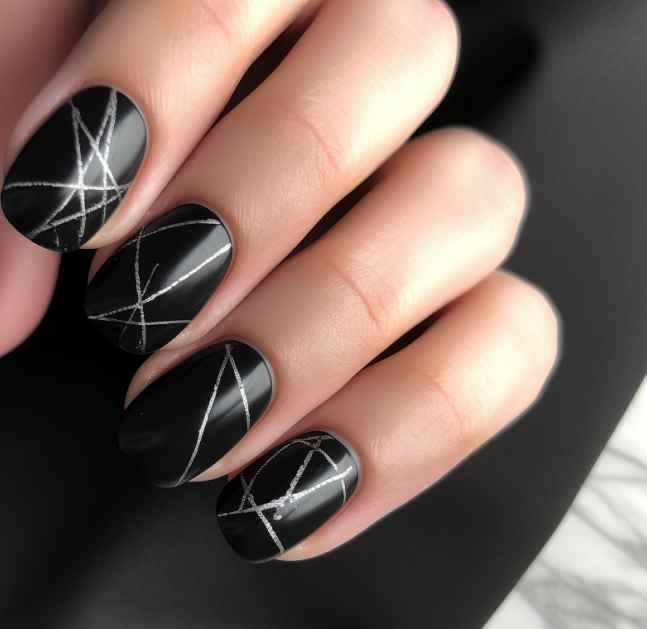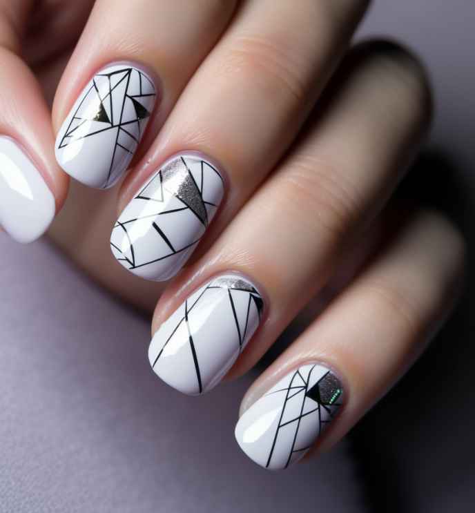 - Короткие ногти приобретут гармоничный вид, если прибегнуть к созданию на них негативного пространства. Ногти покрывают прозрачным лаком, на который наносят блестящие разводы фольгированной потали, рисунки, выполненные контурным черным цветом.
