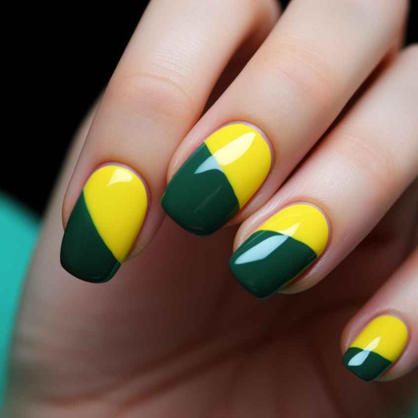 - Нанесите яркий цвет на один или несколько ногтей и оставьте остальные в нейтральной гамме. При желании сделать ногти максимально броскими обращаются к технике «колор-блок». Пластины разделяют на отдельные участки с помощью зонирования. После каждую область окашивают в яркие контрастные оттенки.