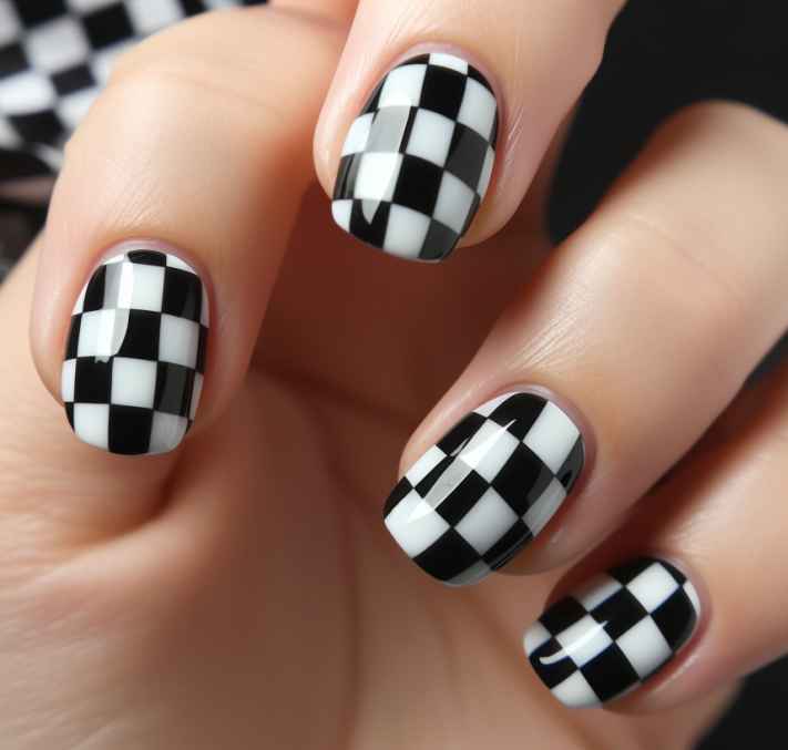 - Один из трендов 2024 года – геометрия, создающаяся в виде шахматного черно-белого рисунка. Сдержанные тона отлично сочетаются между собой и не перегружают короткие ногти. Узор можно нанести на все пальцы или выбрать один ноготь для акцентирования.