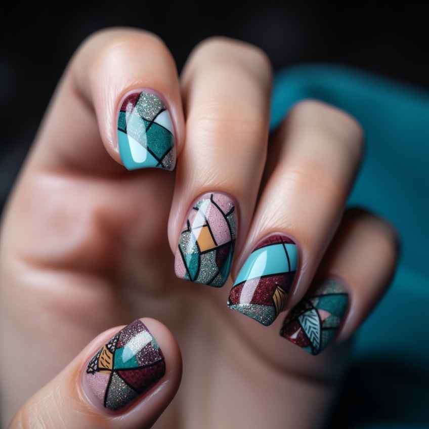 - Используйте тонкую кисть или наклейки для создания геометрических узоров на ногтях. Можно нанести линии, треугольники, полосы. Некоторые фигуры заполняют с помощью выкладывания блестками либо стразами.