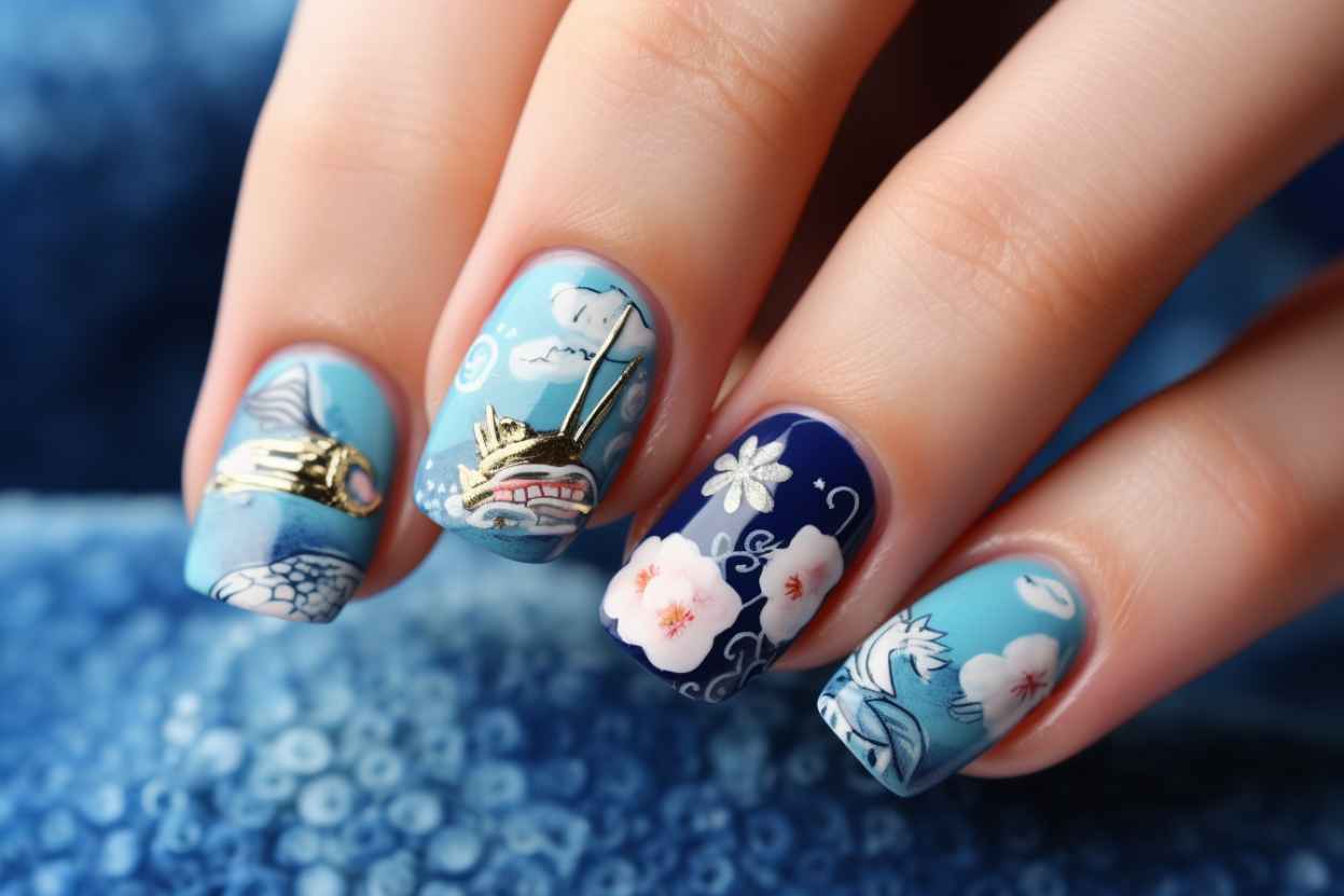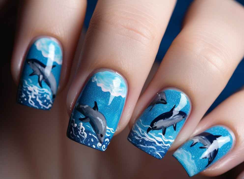 - Приветствуется акцентирование безымянного или какого-либо другого пальца с помощью изображения рыбки или дельфина. Остальные пластины можно окрасить голубым однотонным лаком или создать на них имитацию волн.