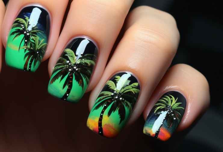 - Красиво и органично смотрится маникюр на море, дополненный изображениями тропических пальм. На ногтевых пластинах прорисовываются деревья или отдельные листья. Можно проявить фантазию и изобразить рисунок в виде кокоса в разрезе.