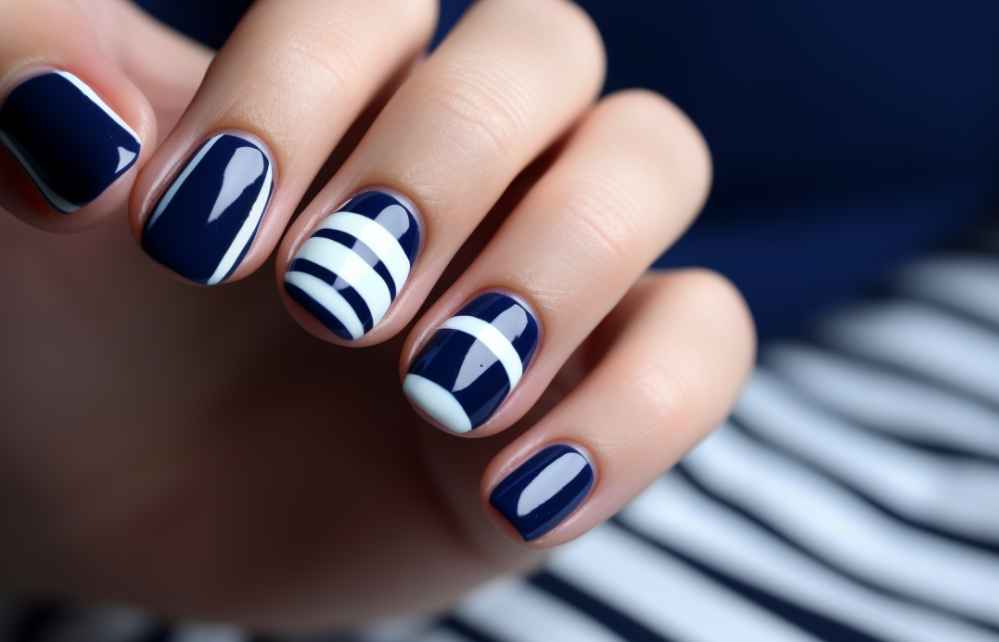- Классический френч предлагается обыграть в оригинальной интерпретации, окрасив область «улыбки» сине-белыми полосками, ассоциирующимися с морской тельняшкой.