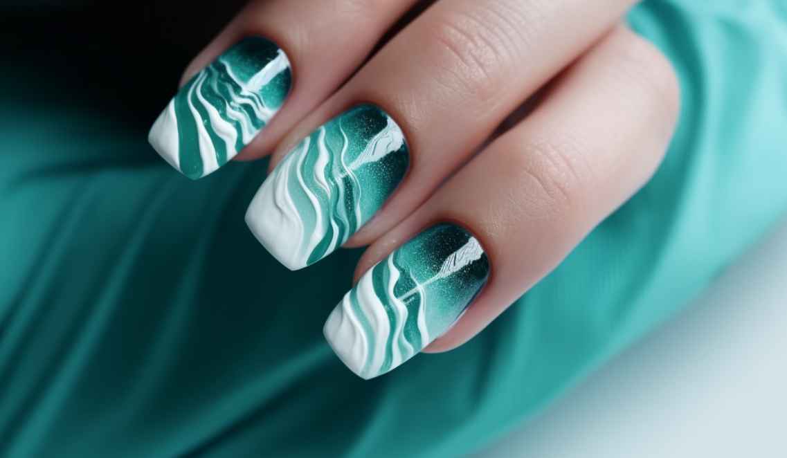 - Неординарным воплощением омбре станет градиентный эффект, созданный в виде извилистых полосок, напоминающих волны. Переход осуществляется от белого к бирюзовому и насыщенному аквамариновому оттенку.