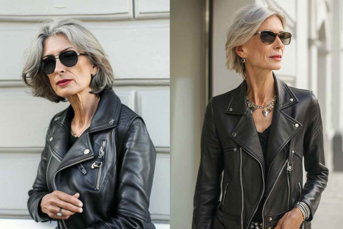 - Куртка-косуха – вещь, которая привнесет в образ дерзкие нотки. Она предназначена не только для юных модниц, но и для женщин за 40 лет, не боящихся смелых экспериментов. Стоит обратиться к игре на контрасте, выражающейся в сочетании косухи с женственным платьем. Обувь может быть как в элегантном, так и в спортивном стиле.
