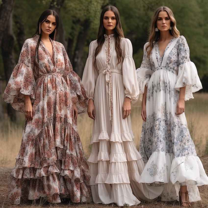 - В стиль бохо-шик органично впишутся платья, юбки и блузка, дополненные широкими воланами или многослойными рюшами. Образ приобретает романтичные черты.