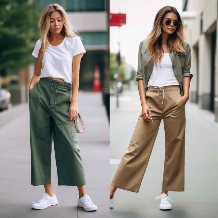 - Широкие брюки могут быть выполнены в различных стилях: от спортивного до элегантного и вечернего. Для создания повседневного либо делового образа можно выбрать брюки из хлопка, шерсти, сочетающиеся с топами, блузами и футболками.