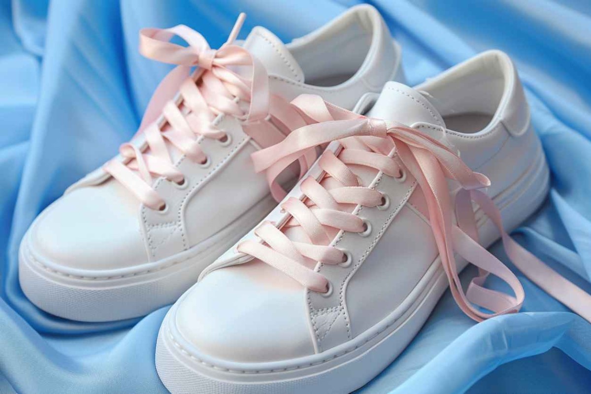 - Романтичным модницам придутся по душе модели, в которых шнурки заменены широкими атласными лентами. Такой дизайн особенно органично смотрится в пастельной тональности. Также трендовыми считаются базовые модели с однотонными шнурками или с разноцветными контрастными деталями.