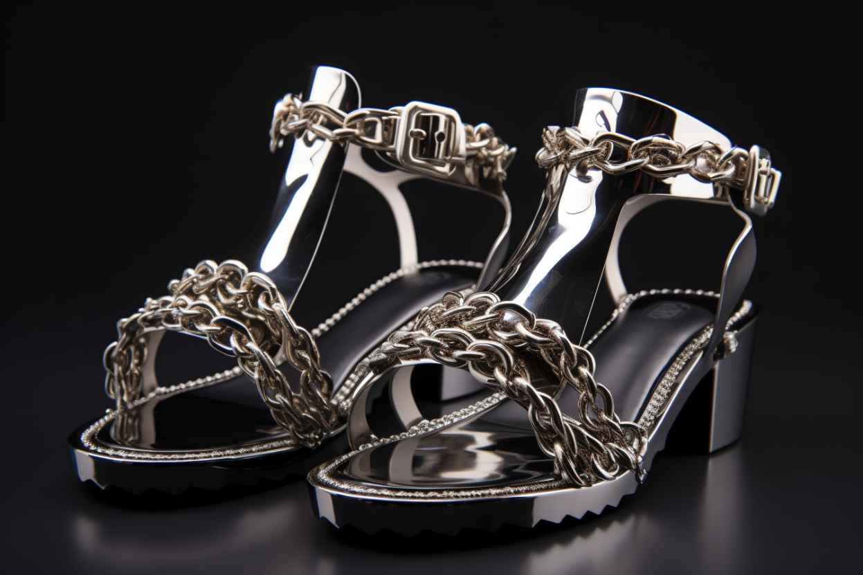 - Подчеркнуть изящность стопы помогут модели с верхом, дополненным серебристыми или золотистыми цепочками. Детали выполняют функцию декора, для фиксации предусмотрены традиционные кожаные ремешки.