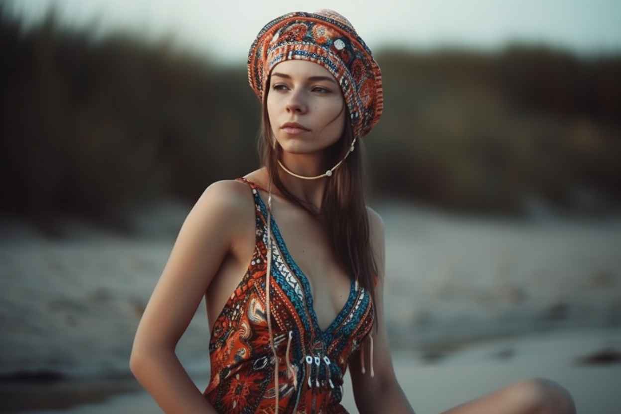 - Оригинально смотрятся этнические орнаменты, ассоциирующиеся со стилем бохо. Принтованной может быть только верхняя или нижняя часть либо все детали купальника. Допускается сочетание с бахромой, органично вписывающейся в общую стилистику образа.