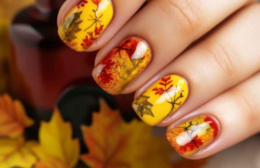 - Лаки теплых оттенков отлично подойдут для создания как дизайна на осеннюю тематику, так и для весеннего либо летнего нейл-арта. В первом случае на ногтях изображают желто-оранжевые листья. Во втором – приветствуется цветочная или фруктовая тематика. Последняя выражается в прорисовке лимона в разрезе. Рисунок разрешается дополнить объемными прозрачными каплями, придающими маникюру свежие нотки.