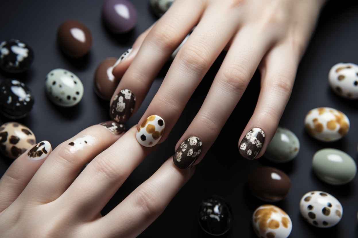 - Трендовым продолжает оставаться узор «перепелиное яйцо», создающийся путем прорисовки мелких черных точек. Рисунок будет выигрышно выделяться на светлом или ярком неоновом фоне. Альтернативная идея – узор «паутинка», воплощаемый с помощью тонких изящных линий. По желанию рисунок дополняют мелкими блестками, органично вплетающимися в общий орнамент.