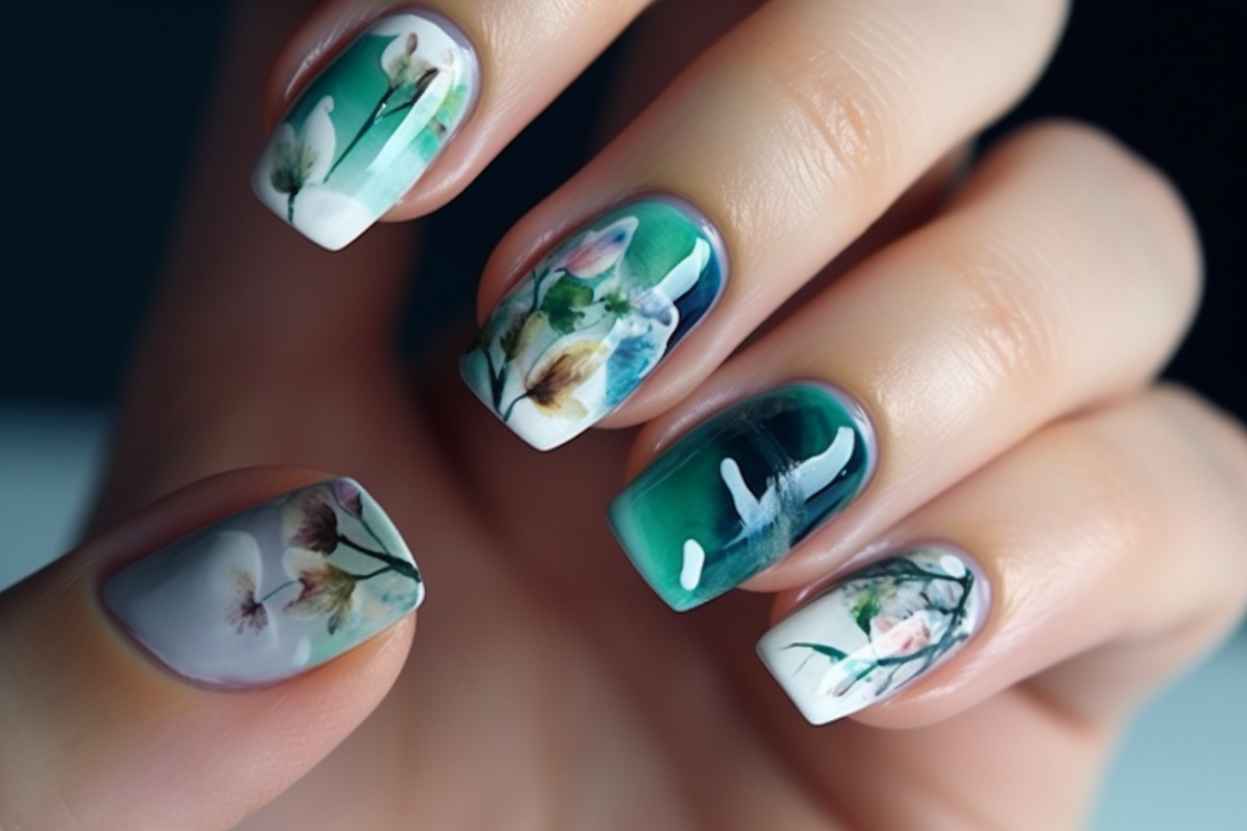 - Зеленые оттенки ассоциируются с весенней свежестью. В подобных тонах предлагается нанести тонкие растительные узоры или изящные рисунки в стиле «Тиффани». В последнем случае приветствуется декорирование стразами либо блестками.