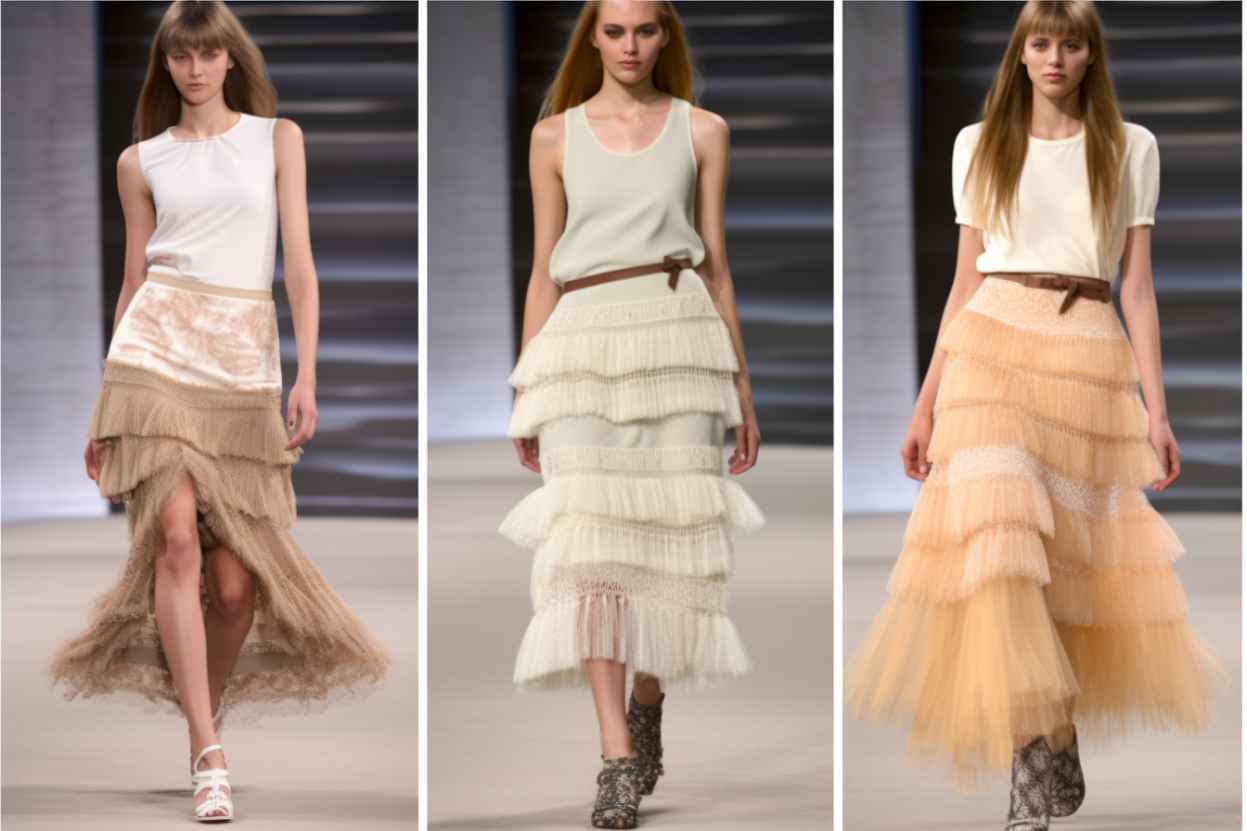 - Воплощением романтичности станут модные юбки с эффектом многослойности. Для этого стилисты прибегают к созданию воланов, пришитых один над другим. Верх к такой юбке рекомендуется подбирать лаконичный, чтобы уравновесить силуэт.
